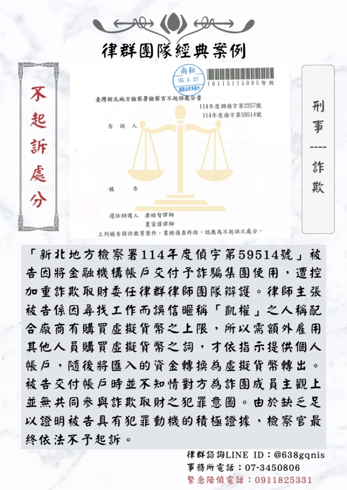 「新北地方檢察署114年度偵字第59514號」被告因將金融機構帳戶交付予詐騙集團使用,遭控加重詐欺取財委任律群律師團隊辯護。律師主張被告係因尋找工作而誤信暱稱「凱權」之人稱配合廠商有購買虛擬貨幣之上限,所以需額外雇用其他人員購買虛擬貨幣之詞,才依指示提供個人帳戶,隨後將匯入的資金轉換為虛擬貨幣轉出。被告交付帳戶時並不知情對方為詐團成員主觀上並無共同參與詐欺取財之犯罪意圖。由於缺乏足以證明被告具有犯罪動機的積極證據,檢察官最終依法不予起訴。