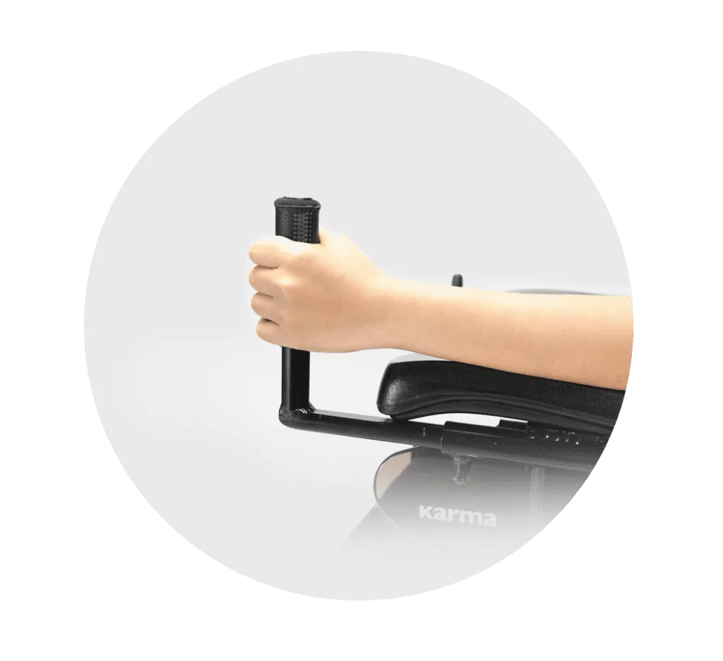 座高含墊僅545mm,搭配新版撥腳機構降低轉動阻力,搭配一鍵後掀扶手,完成上下車與轉移位動作。