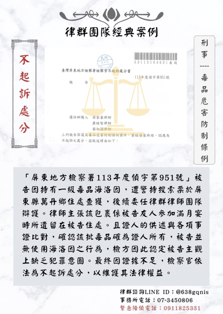 「屏東地方檢察署113年度偵字第951號」被告因持有一級毒品海洛因,遭警持搜索票於屏東縣萬丹鄉住處查獲,後續委任律群律師團隊辯護。律師主張該包裹係被告友人參加滿月宴時所遺留在被告住處。且證人的供述與各項事證比對,確認該批毒品確為證人所有,被告並無使用海洛因之行為,檢方因此認定被告主觀上缺乏犯罪意圖。最終因證據不足,檢察官依法為不起訴處分,以維護其法律權益。