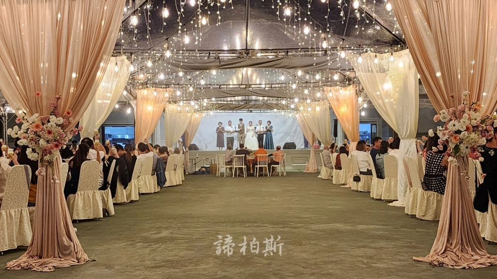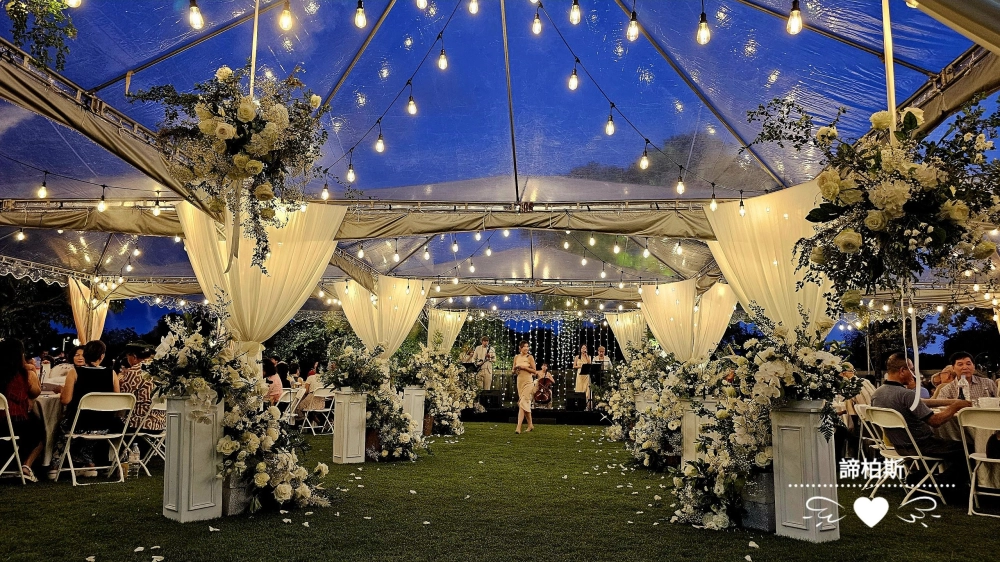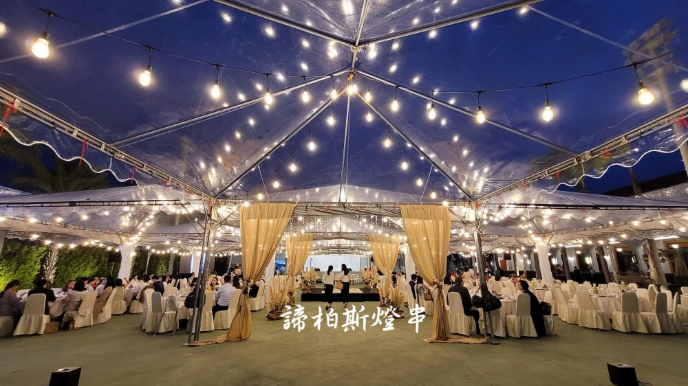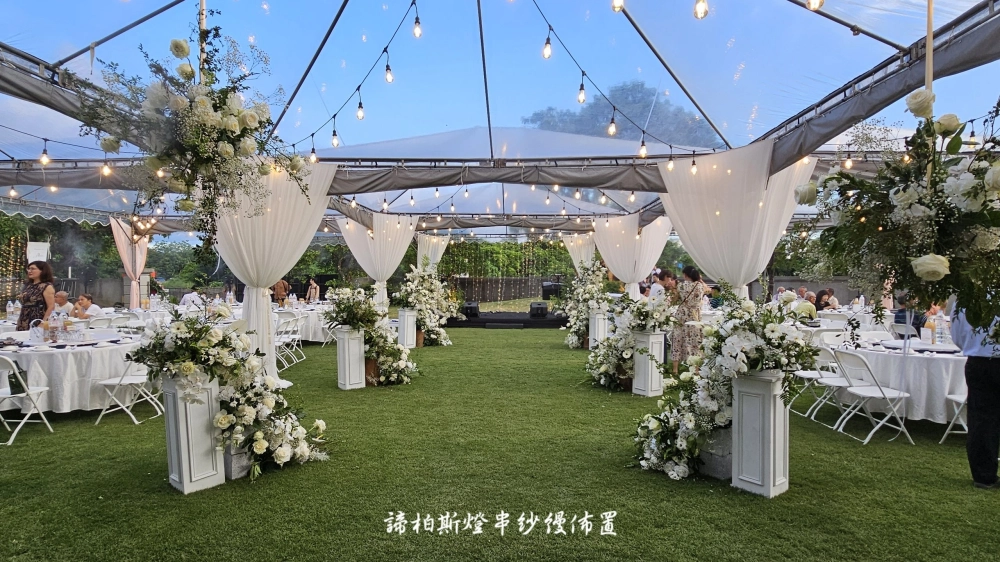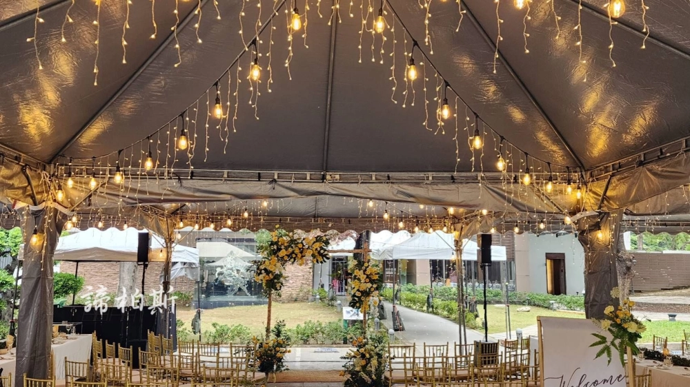 • 戶外婚禮遇到雨天帳棚內燈串紗幔佈置