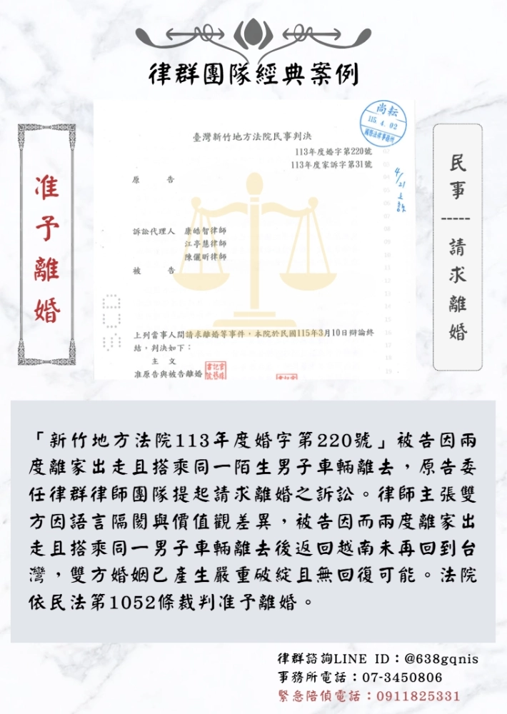 「新竹地方法院113年度婚字第220號」被告因兩度離家出走且搭乘同一陌生男子車輛離去,原告委任律群律師團隊提起請求離婚之訴訟。律師主張雙方因語言隔閡與價值觀差異,被告因而兩度離家出走且搭乘同一男子車輛離去後返回越南未再回到台灣,雙方婚姻已產生嚴重破綻且無回復可能。法院依民法第1052條裁判准予離婚。