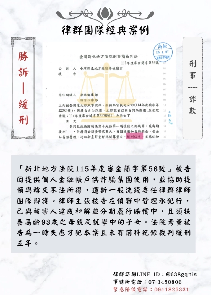 「新北地方法院115年度審金簡字第56號」被告因提供個人金融帳戶供詐騙集團使用,並協助提領與轉交不法所得,遭訴一般洗錢委任律群律師團隊辯護。律師主張被告在偵審中皆坦承犯行,已與被害人達成和解並分期履行賠償中,且須扶養高齡93歲之母親及就學中的子女。法院考量被告為一時失慮才犯本案且未有前科紀錄裁判緩刑五年。