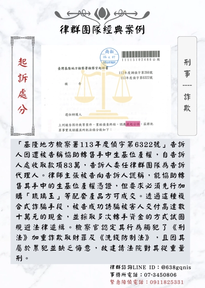 「基隆地方檢察署113年度偵字第6322號」告訴人因遭被告稱協助轉售手中生基位產權,自告訴人處收取款項83萬,告訴人委任律群團隊為告訴代理人。律師主張被告向告訴人謊稱,能協助轉售其手中的生基位產權憑證,但要求必須先行加購「琉璃玉」等配套產品方可成交。透過這種複合式詐騙手段,被告成功誘騙被害人交付高達數十萬元的現金,並採取多次轉手資金的方式試圖規避法律追緝。檢察官認定其行為觸犯了《刑法》加重詐欺取財罪及《洗錢防制法》,且因其屬於累犯並缺乏悔意,故建請法院對其從重量刑。