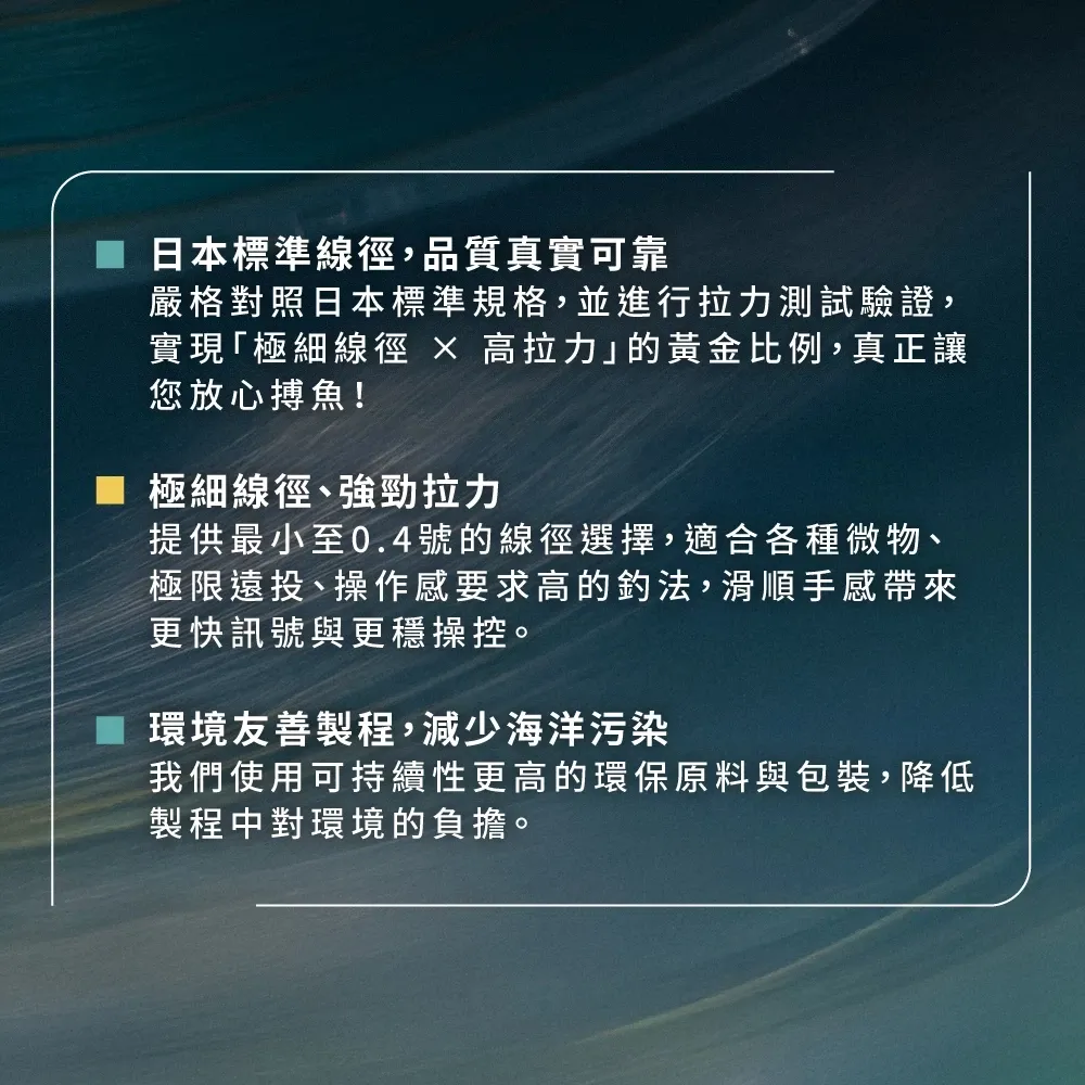 ■最小號至0.4號線徑,極細極滑順的手感更擁有強大的拉力值,適合追求極限拋投距離的釣友