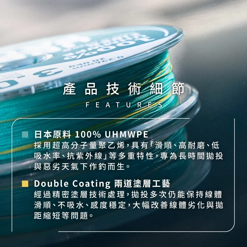 ■Double Coating 兩次的塗層工藝經多次反覆拋投依然滑順極低的吸水率,大幅改善拋投距離降低、感度變差的問題