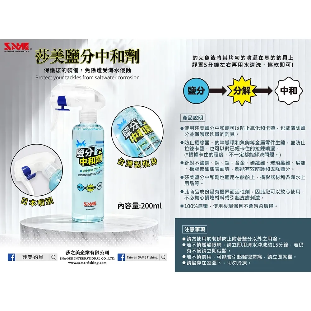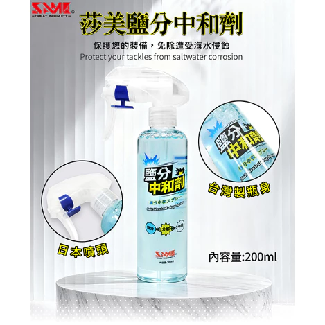 ●使用莎美鹽分中和劑可以防止氧化和卡鹽,也能清除鹽分並保護您珍貴的釣具。