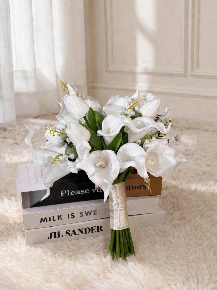 這束花是韓式白色手捧花,主要花材為:馬蹄蓮、鬱金香、鈴蘭(山谷百合),風格優雅聖潔,適合婚禮/領證/寫真場景。