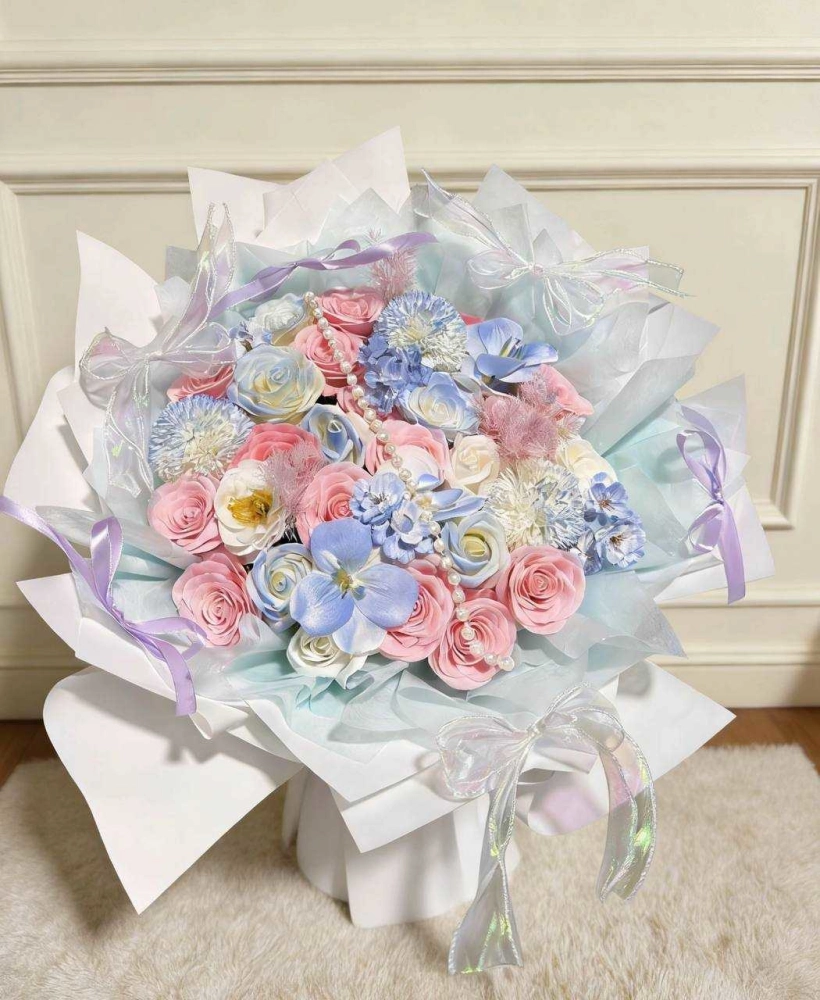 這束粉藍幻境繡球玫瑰手作花束,以馬卡龍粉與清透藍交織,搭配柔軟繡球與蝴蝶蘭點綴,像把春日的雲朵與夢境都包進花裡,是送給閨蜜、戀人或自我犒賞的浪漫選擇。