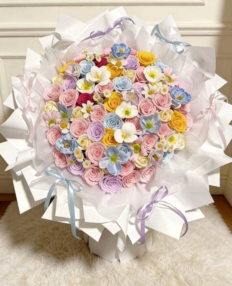 這束粉藍幻境繡球玫瑰手作花束,以馬卡龍粉與清透藍交織,搭配柔軟繡球與蝴蝶蘭點綴,像把春日的雲朵與夢境都包進花裡,是送給閨蜜、戀人或自我犒賞的浪漫選擇。