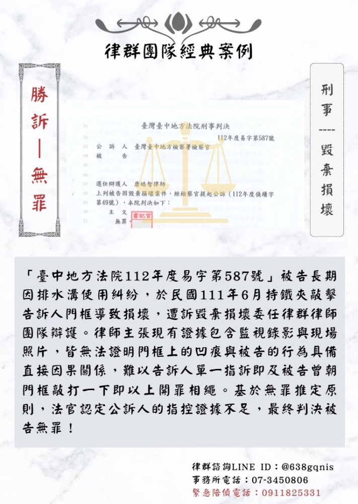 「臺中地方法院112年度易字第587號」被告長期因排水溝使用糾紛,於民國111年6月持鐵夾敲擊告訴人門框導致損壞,遭訴毀棄損壞委任律群律師團隊辯護。律師主張現有證據包含監視錄影與現場照片,皆無法證明門框上的凹痕與被告的行為具備直接因果關係,難以告訴人單一指訴即及被告曾朝門框敲打一下即以上開罪相繩。基於無罪推定原則,法官認定公訴人的指控證據不足,最終判決被告無罪!