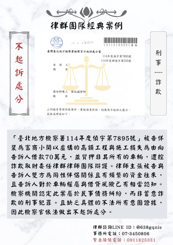 「臺北地方檢察署114年度偵字第7895號」被告佯裝為富商小開以虛構的高額工程與施工損失為由向告訴人借款70萬元,並質押非其所有的車輛,遭控詐欺取財委任律群律師團隊辯護。律師主張被告與告訴人雙方為同性伴侶關係且有頻繁的資金往來,且告訴人對於車輛權屬與借貸風險已有相當認知。檢察機關認定此案屬於民事債務糾紛,而非蓄意詐欺的刑事犯罪。且缺乏具體的不法所有意圖證據,因此檢察官依法做出不起訴處分。