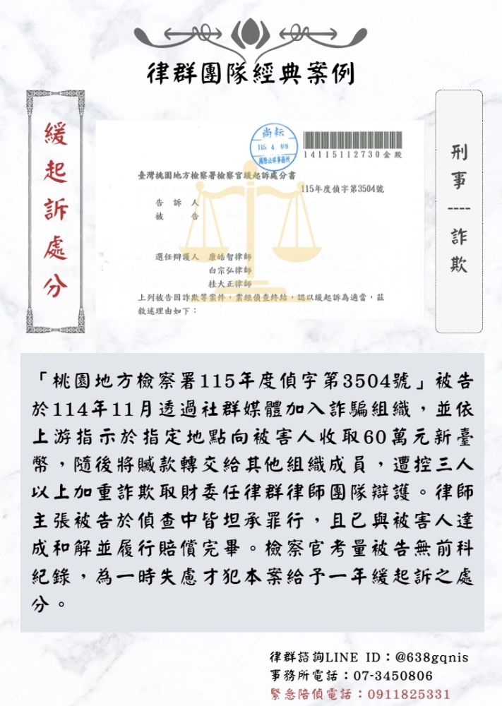 「桃園地方檢察署115年度偵字第3504號」被告於114年11月透過社群媒體加入詐騙組織,並依上游指示於指定地點向被害人收取60萬元新臺幣,隨後將贓款轉交給其他組織成員,遭控三人以上加重詐欺取財委任律群律師團隊辯護。律師主張被告於偵查中皆坦承罪行,且已與被害人達成和解並履行賠償完畢。檢察官考量被告無前科紀錄,為一時失慮才犯本案給予一年緩起訴之處分。