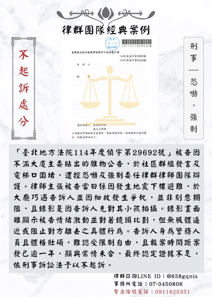 「臺北地方法院114年度偵字第29692號」被告因不滿大廈主委貼出的雜物公告,於社區群組發言及電梯口圍堵,遭控恐嚇及強制委任律群律師團隊辯護。律師主張被告當日係因發生地震下樓避難,於大廳巧遇告訴人並因細故發生爭執,並非刻意攔阻,且錄影是因告訴人先對其小孩拍攝。錄影畫面雖顯示被告情緒激動並對著鏡頭比劃,但無肢體逼近或阻止對方離去之具體行為。告訴人身為警務人員且體格壯碩,難認受限制自由,且報案時間距案發已逾一年,顯與常情未合,最終認定證據不足,依刑事訴訟法予以不起訴。
