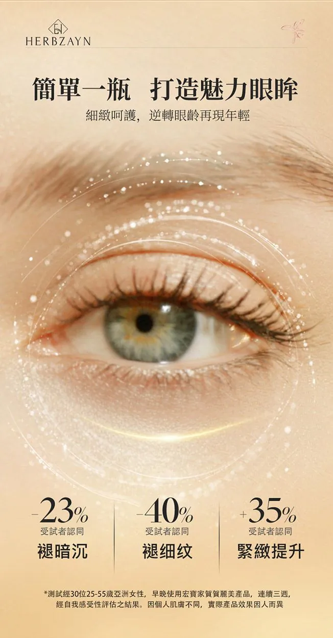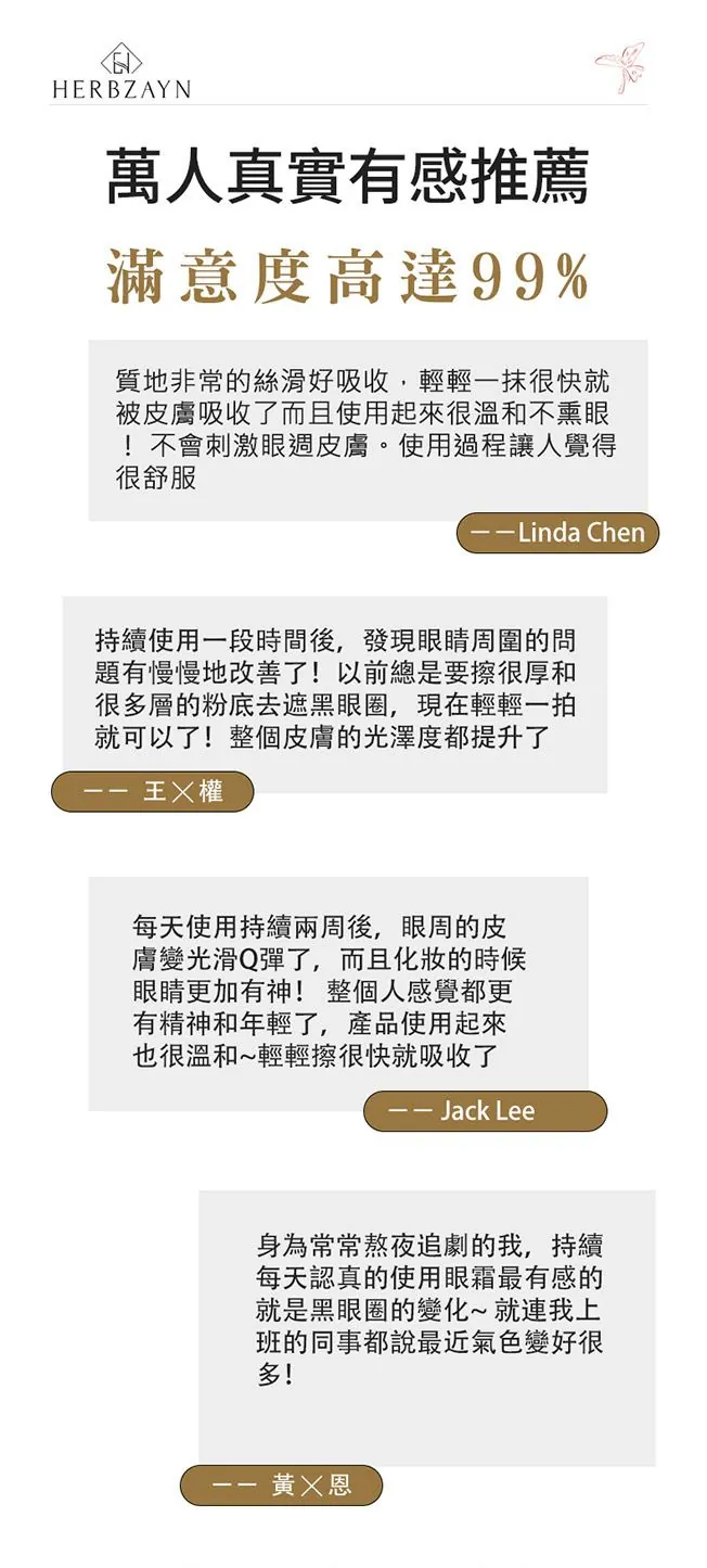 FLAWLESS REVITALIZING EYE CREAM 眼部瑕疵橡皮擦, 輕鬆擦去年齡痕跡 1. 抗 · 眼紋 - 抗動靜態紋,緊緻彈嫩 2. 潤 · 眼周 - 注水保濕,提亮彈潤 3. 淡 · 淚溝 - 深層修護,淡化淚溝暗沉 4. 護 · 肌底 - 提升眼周保護力,撫平細紋 5. 促 · 循環 - 促進眼周代謝,改善眼袋熊貓眼 產品不含酒精、環境賀爾蒙、西藥等有害物質,孕媽咪和敏感肌皆可以安心使用 我要購買