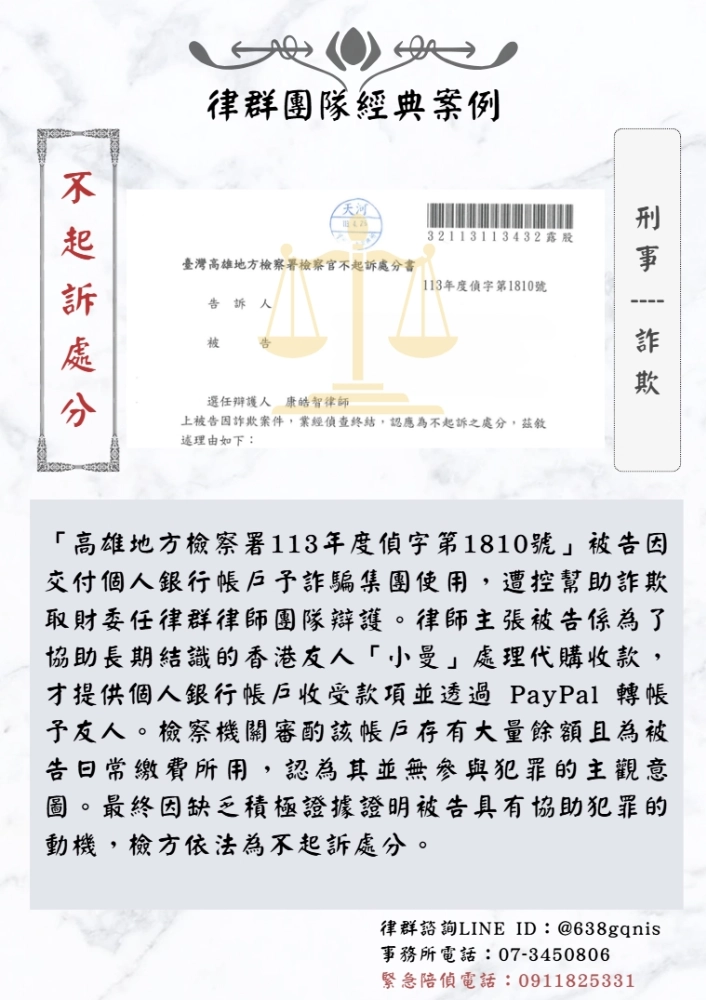 「高雄地方檢察署113年度偵字第1810號」被告因交付個人銀行帳戶予詐騙集團使用,遭控幫助詐欺取財委任律群律師團隊辯護。律師主張被告係為了協助長期結識的香港友人「小曼」處理代購收款,才提供個人銀行帳戶收受款項並透過 PayPal 轉帳予友人。檢察機關審酌該帳戶存有大量餘額且為被告日常繳費所用,認為其並無參與犯罪的主觀意圖。最終因缺乏積極證據證明被告具有協助犯罪的動機,檢方依法為不起訴處分。