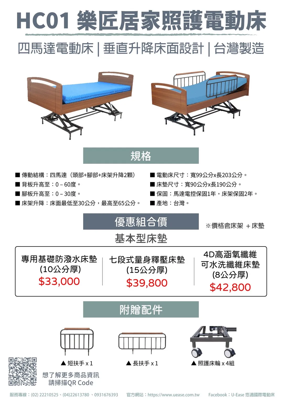 HC01 樂匠居家照護床 ,四馬達垂直床面升降設計,滿足您照護上的需求。