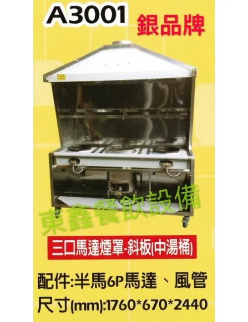全新 A3001 銀品 牌 3口斜板煙罩型馬達炒台(中湯桶)