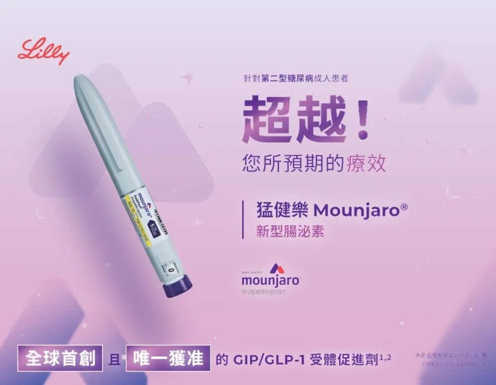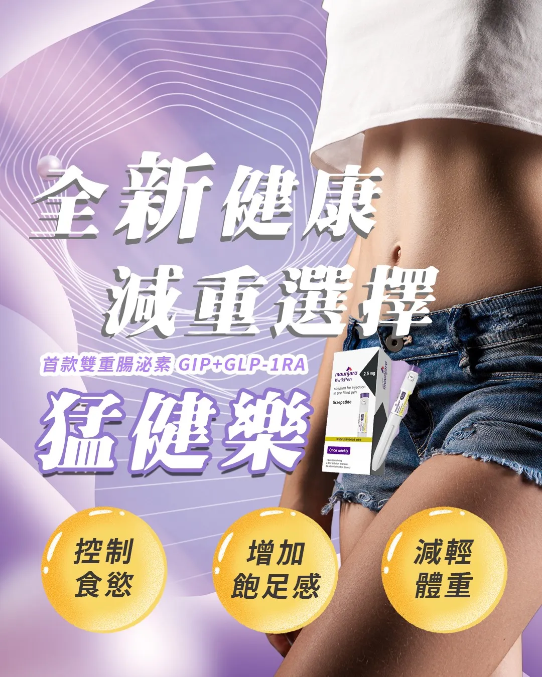 Mounjaro 猛健樂注射劑經衛生福利部核准,用於第二型糖尿病血糖管理及肥胖相關疾病患者的體重控制輔助治療。該藥品透過皮下注射將活性成分替澤帕肽(Tirzepatide)導入人體,同時活化 GIP 與 GLP-1 雙效腸泌素,促進胰島素分泌、降低升糖素水平,並延緩胃排空、提升飽腹感,從而有效控制血糖與食慾,實現體重管理目標。