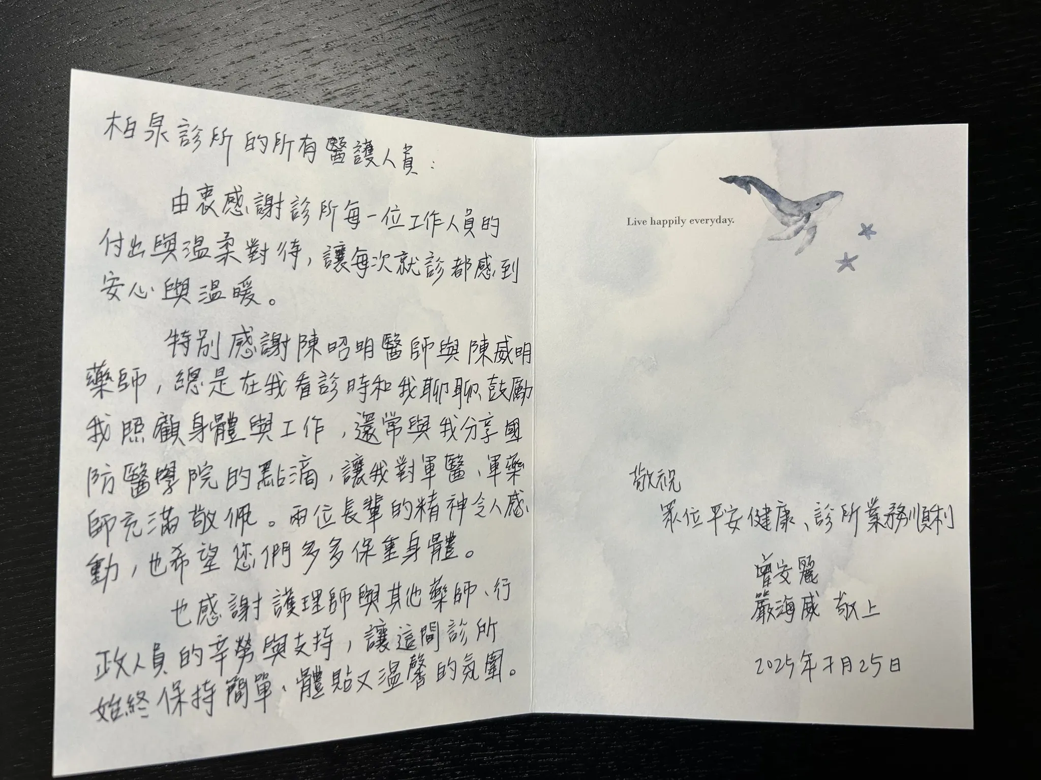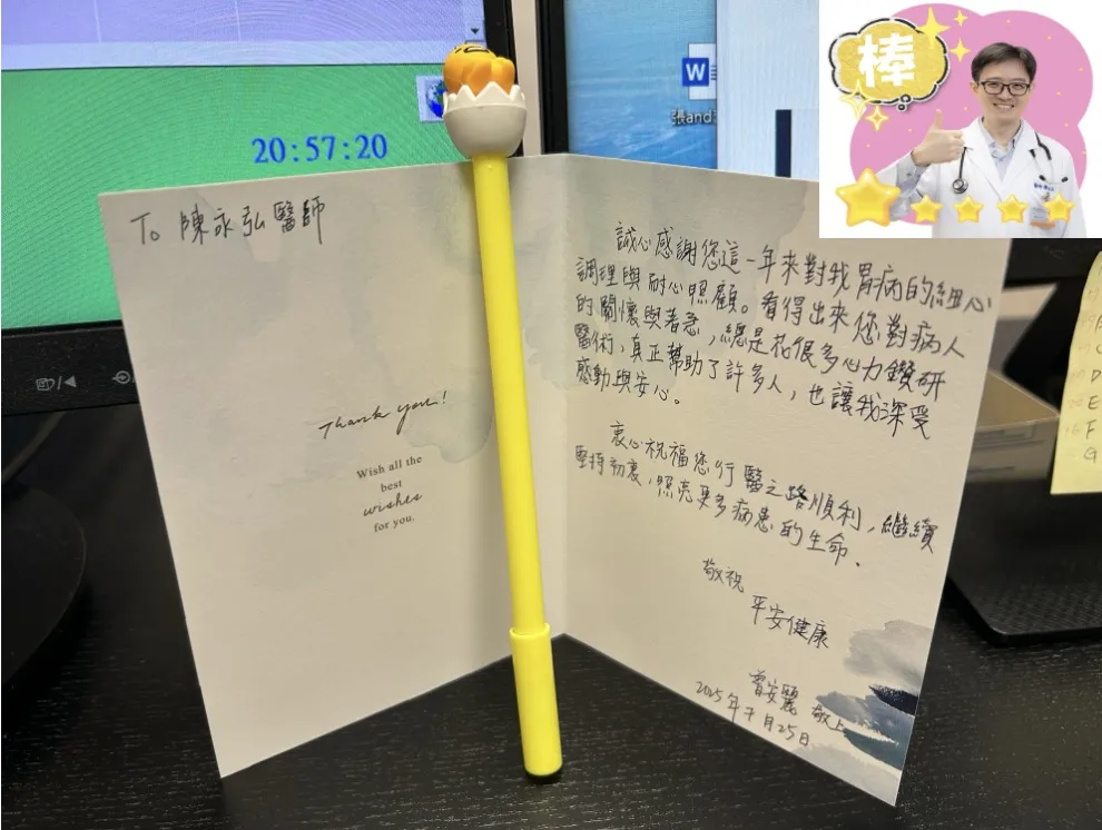 一位20多歲的獸醫師因經常胃痛,腹脹與便秘於一年前來診就醫,經陳醫師治療後,病況漸趨穩定控制。因人生規劃將前往南部工作,昨晚特來柏泉診所拿藥與處方簽,順便贈送感謝卡片,感謝診所醫護人員的照顧。👩‍⚕️ 🧑‍⚕️