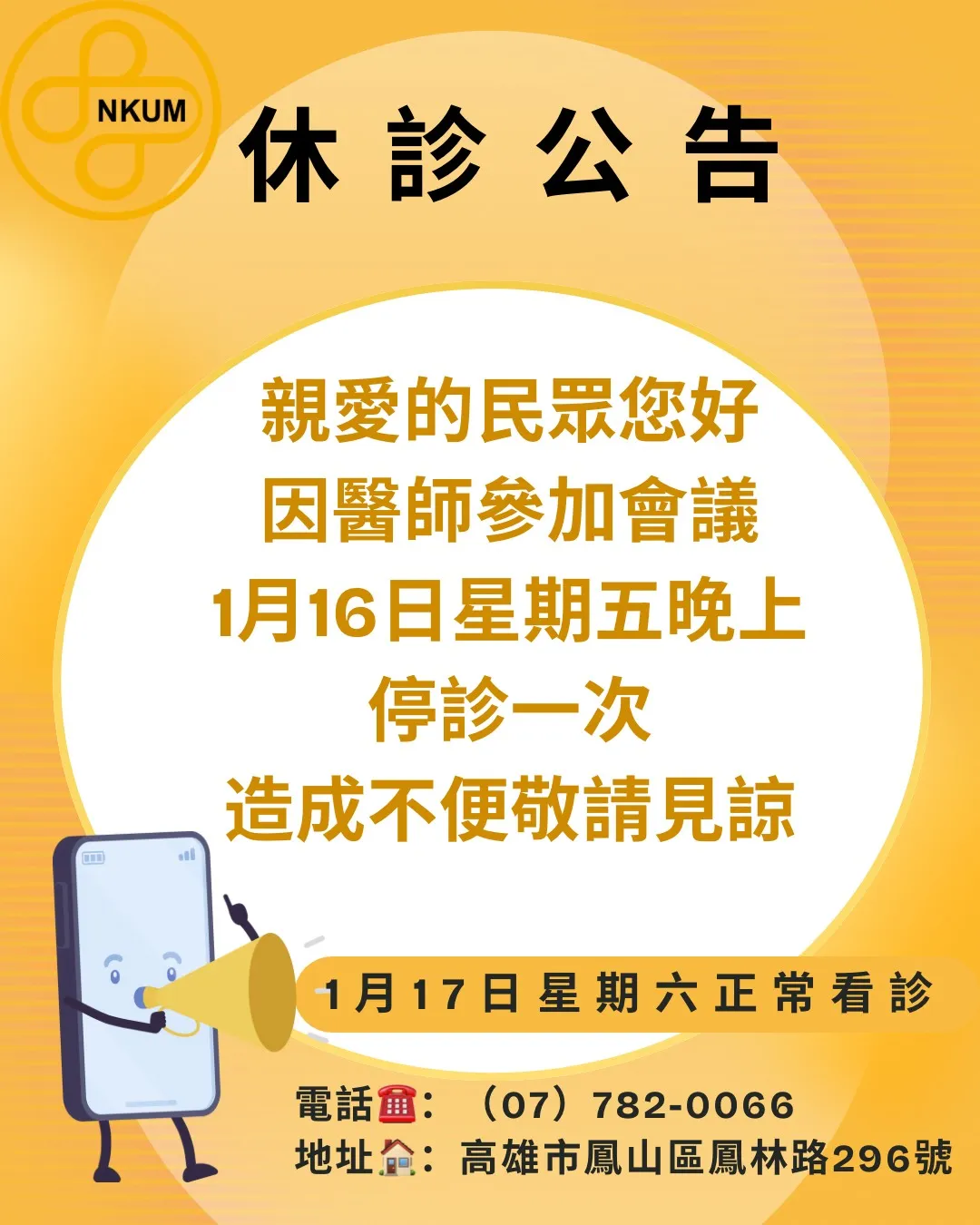 本週1月16日晚上門診,停診一次