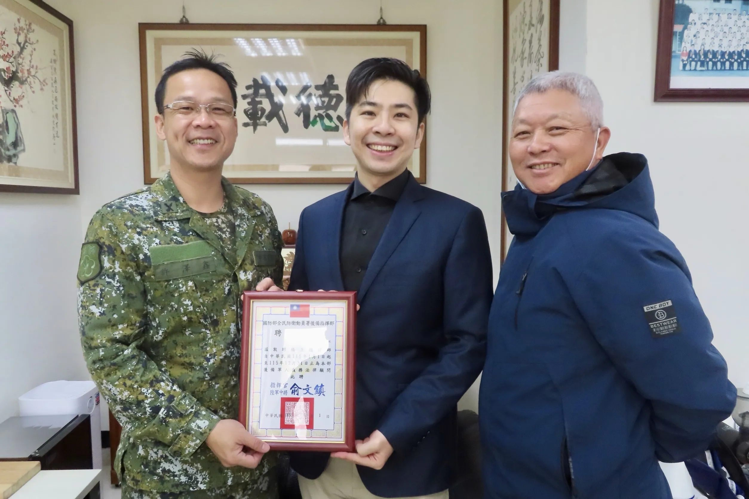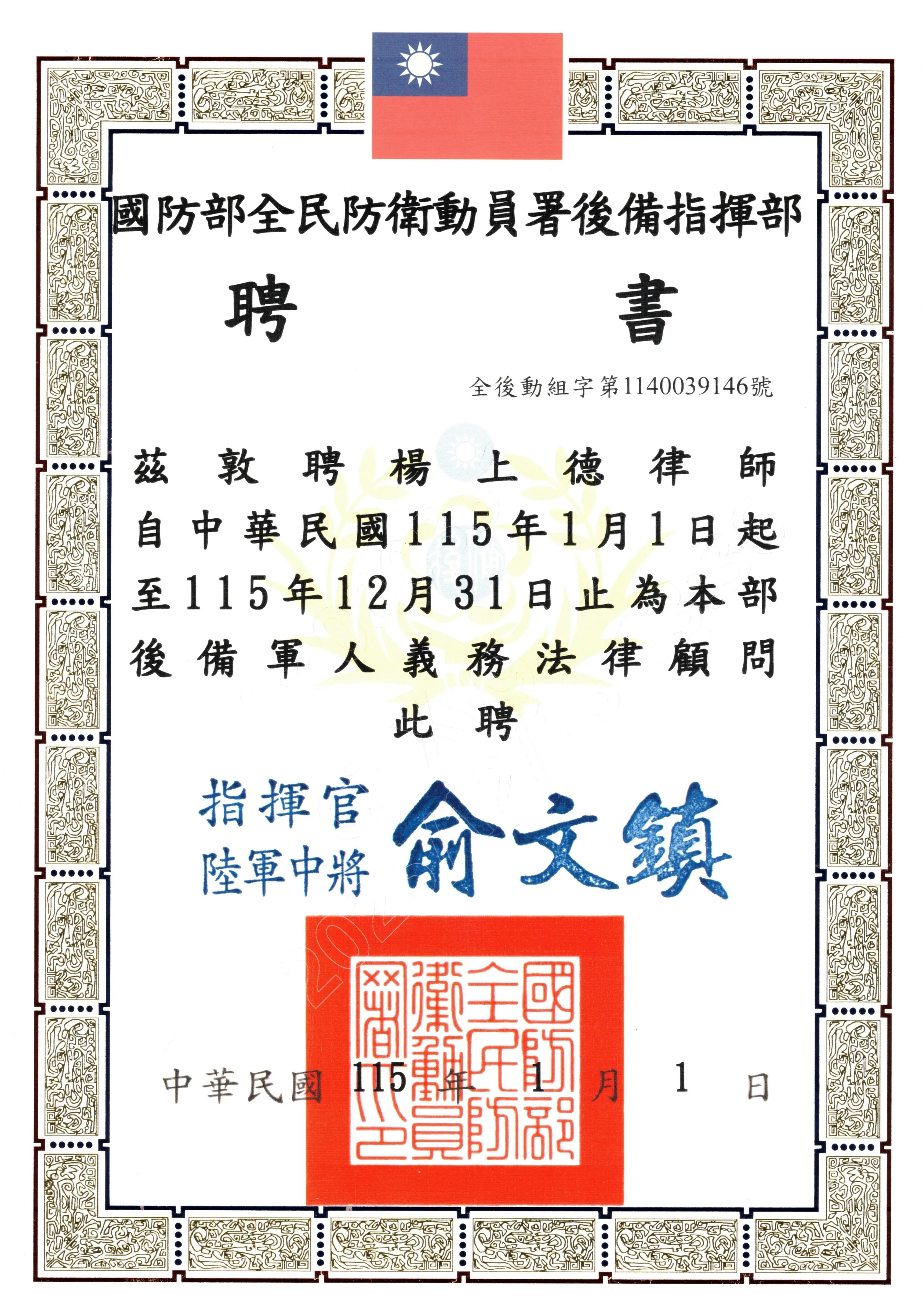 楊上德律師受聘為國防部全民防衛動員署後備指揮部後備軍人義務法律顧問