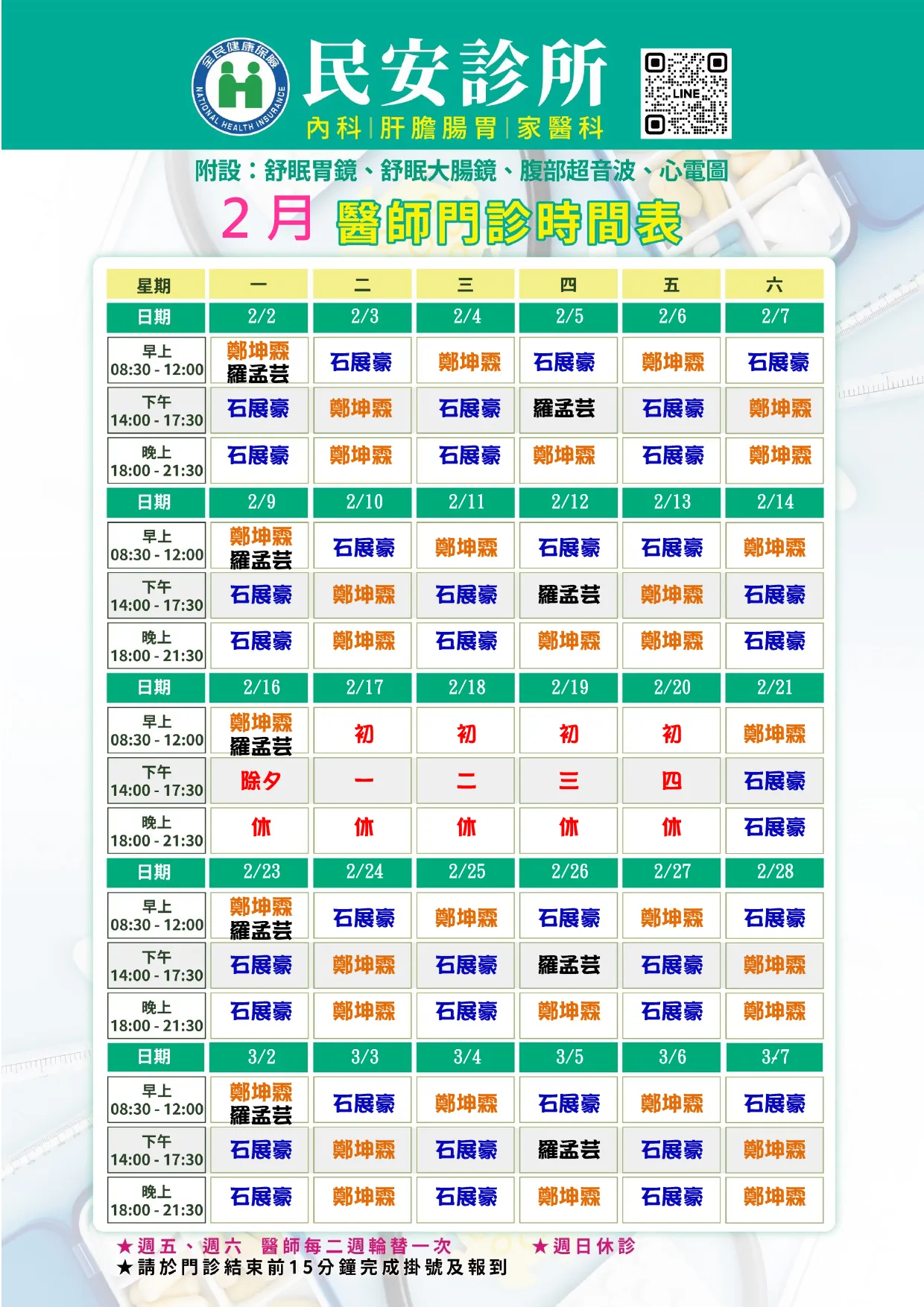 #民安診所 #2月門診表 #成人健康檢查 #國健署健檢#癌症篩檢 #春節健康 #慢性病照護 #台北診所