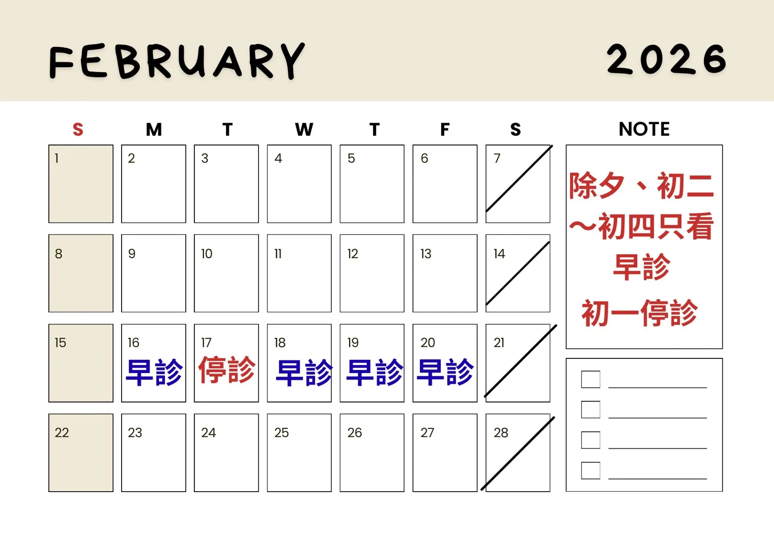 臻行骨科診所2026年02月行事曆