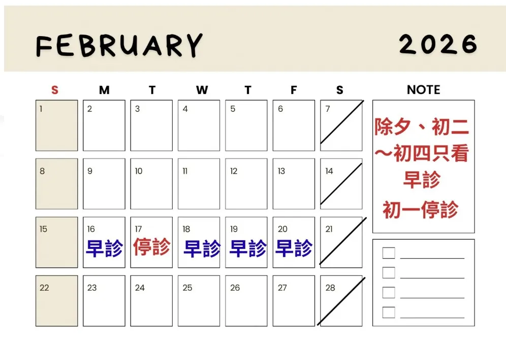 ✔ 春節連假為國定假日,大多數診所與醫療院所可能 部分休診或調整營業時間。建議您安排看診前,務必透過診所行事曆或電話確認最新門診資訊。✔ 若您有 慢性病追蹤、復健安排或定期回診,請提前至春節假期前安排看診與領藥,以免延誤治療進度。