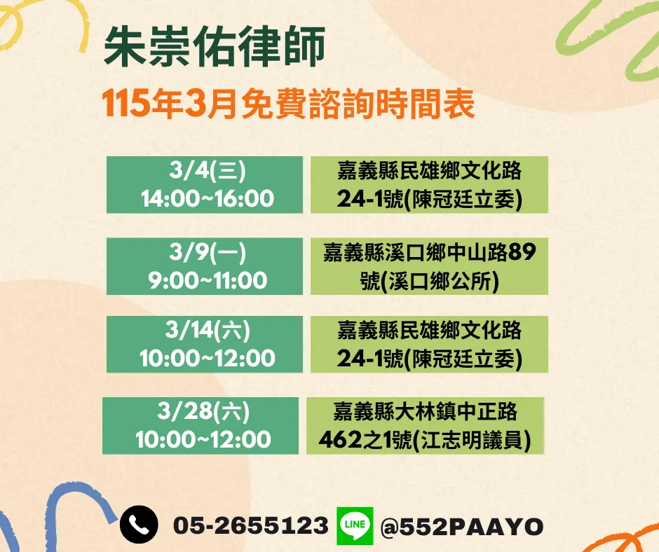 朱崇佑律師115年3月免費諮詢時間表,各場次預約方式如下: