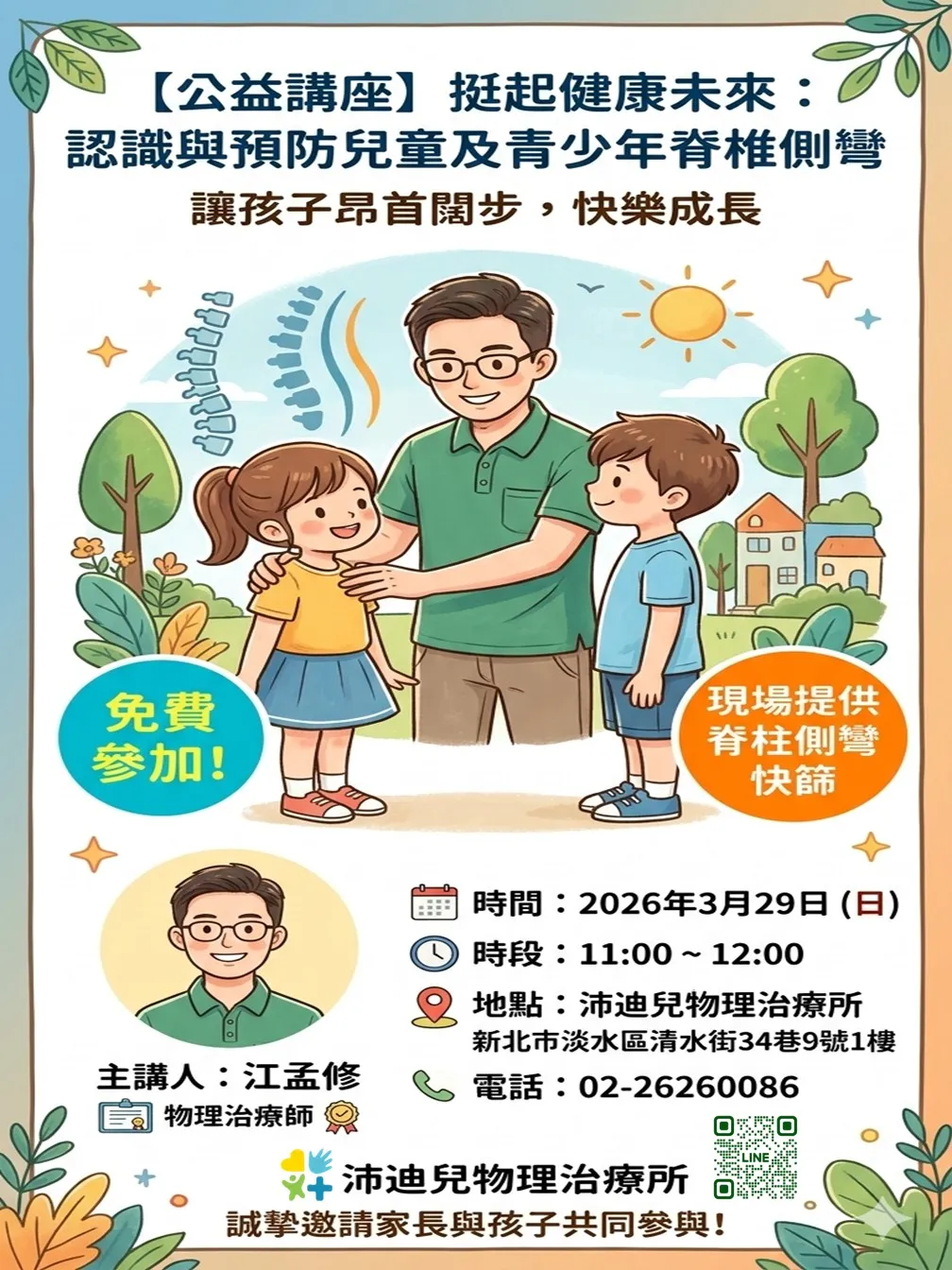 💪 沛迪兒物理治療所本月推出專屬家長與孩子的公益講座,教您如何早期發現、預防與面對脊椎側彎問題。