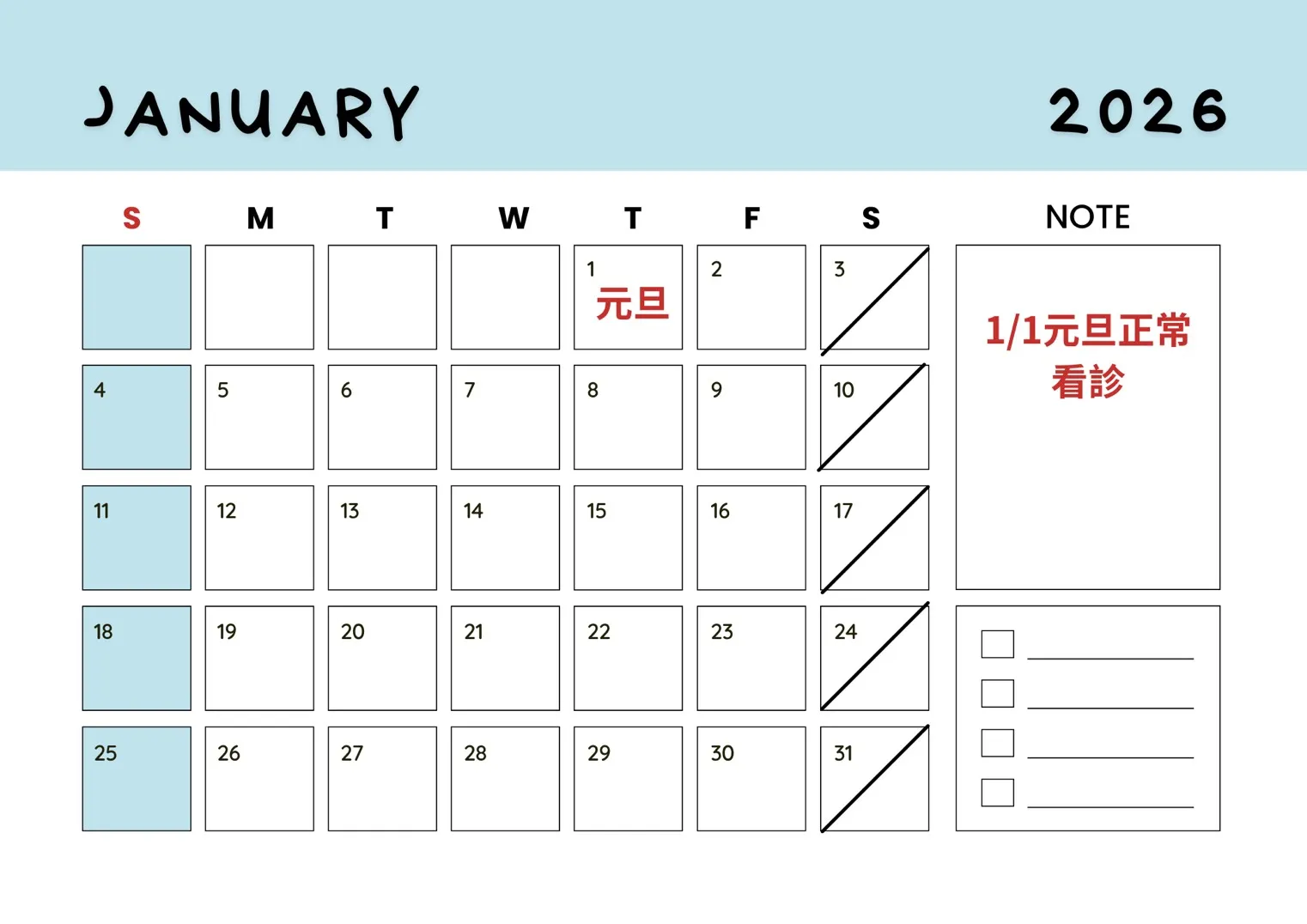 臻行骨科診所2026年01月行事曆